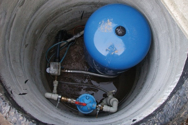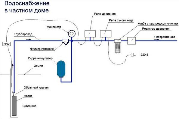 Structurellement, l'ensemble du circuit semble simple. L'élément principal est la pompe. Il soulève l'eau des profondeurs. Peut être situé directement dans le puits (type submersible) ou travailler en surface (pompe de type surface)La première option fournit une prise d'eau d'une plus grande profondeur.