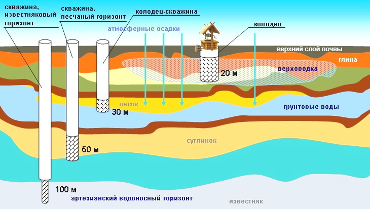 - Eau souterraine. Des aquifères plus stables. Profondeur de plusieurs mètres de la surface à plusieurs dizaines. Ce sont eux qui sont principalement utilisés pour les dispositifs autonomes d'alimentation en eau.