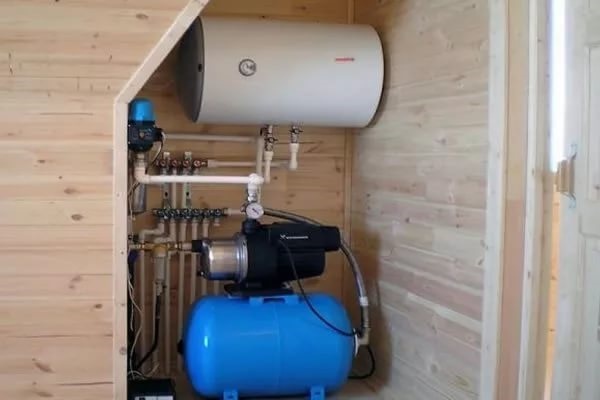 Station de pompage - l'appareil n'est pas trop grand, une telle unité ne prendra pas beaucoup de place. Mais la capacité de l'accumulateur est également faible, donc lorsque l'alimentation est coupée, l'eau cessera presque immédiatement d'entrer dans le système, vous devrez utiliser un seau sur la corde.