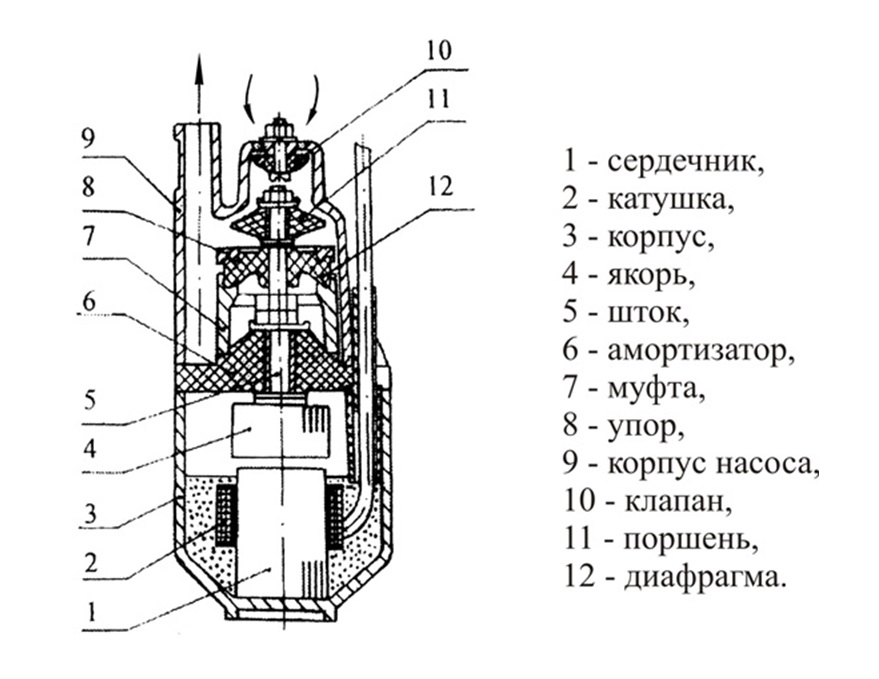 Dans les appareils "Bébé" Les entreprises russes de Livhydromash échouent souvent bobines. Le travail à sec provoque cette nuisance. Des bruits forts générés lorsqu'il est allumé sans pomper de l'eau indiquent rupture de l'axe centralauquel sont fixées des membranes avec ancrage. Cette défaillance peut être facilement détectée après le démontage de l'unité.