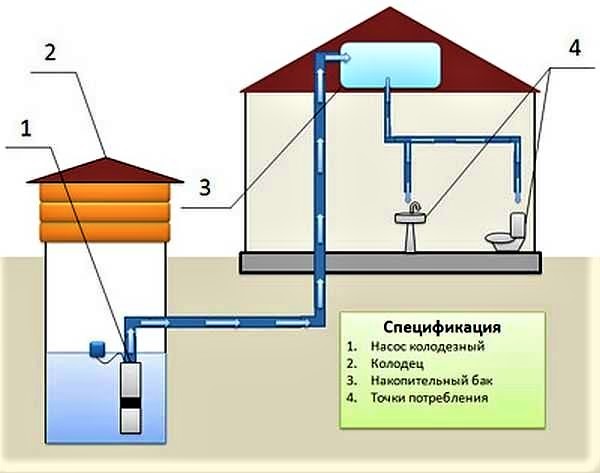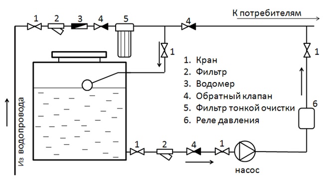 Si vous avez besoin d'une grande quantité d'eau ou d'un approvisionnement plus stable, un autre élément important est inclus dans le circuit - un réservoir de stockage. Tout d'abord, l'eau y pénètre, et ensuite seulement - aux consommateurs.