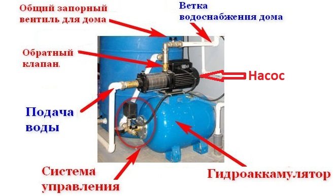 La pompe pompe l'eau dans accumulateur (GA), qui est un réservoir avec un insert interne en matériau élastique, souvent appelé membrane ou poire en raison de sa forme.