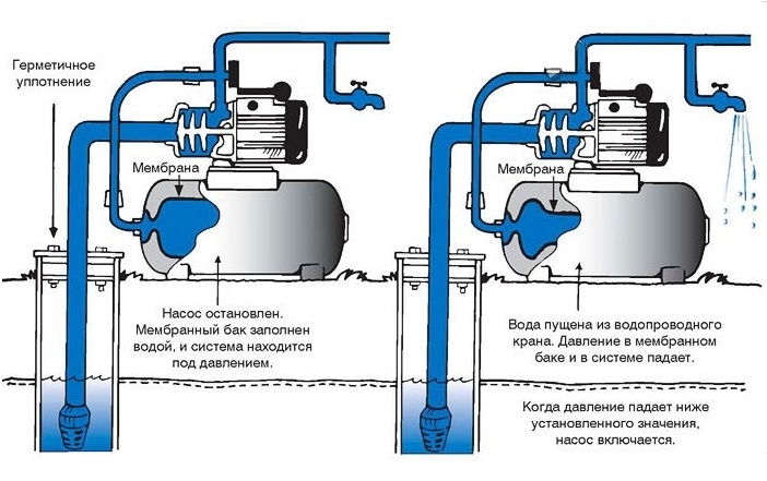 - Lorsque le robinet est ouvert dans la maison, le réservoir à membrane est vide, après quoi l'automatisation redémarre l'équipement de pompage.