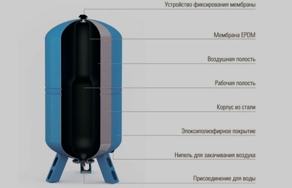 Le dispositif accumulateur pour une station de pompage d'eau est extrêmement simple.Il se compose d'un boîtier métallique et d'une membrane scellée qui divise tout l'espace intérieur en deux parties. Dans le premier, il y a de l'air et dans le second, l'eau est pompée.
