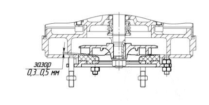 Dévissez ensuite les écrous inférieurs d'un demi-tour. Avec cet ajustement, l'écart sera de 0,3-0,5 mm. L'emplacement réglé du diaphragme par rapport à la roue est fixé par les écrous supérieurs. Après avoir terminé le réglage, il est nécessaire de vérifier la facilité de rotation de la roue, elle doit tourner sans appliquer de force.