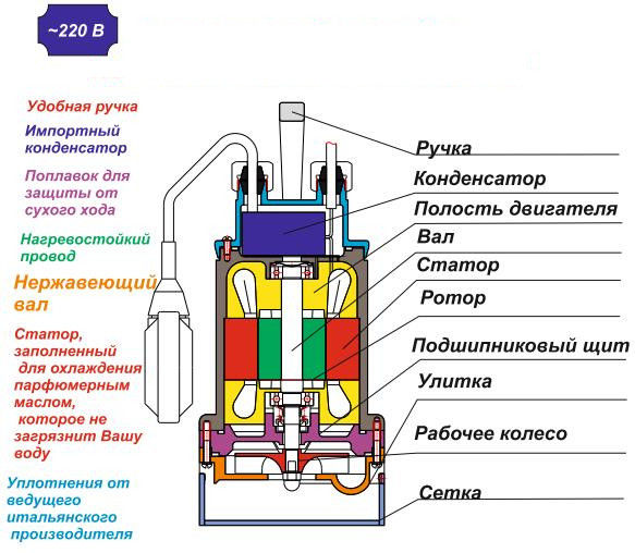 Le moteur est refroidi en raison de l'environnement extérieur et de l'huile, qui se trouve dans une chambre à huile spéciale du moteur électrique. L'huile a également pour fonction de lubrifier les parties frottantes. La vitesse de rotation du rotor et de la roue est de 3000 tr / min. Pendant la rotation, une force centrifuge est générée, qui pousse l'eau à travers le tuyau de décharge.