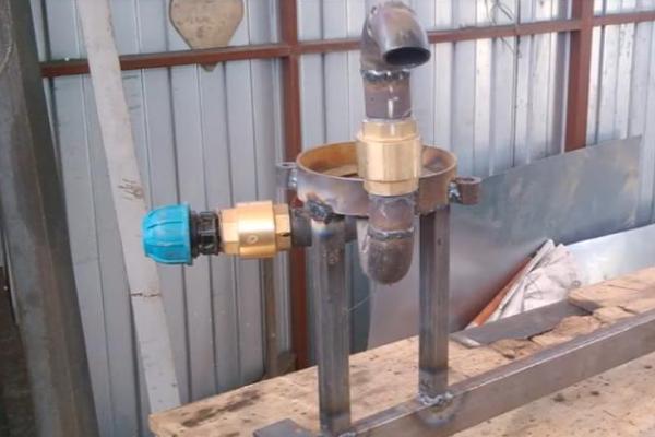 La partie extérieure est complétée par un bec d'un morceau de tuyau d'égout et deux raccords - un té et un angle de 90º. Pendant le mouvement de la poignée vers le haut / bas, l'eau est versée du bec (bec) dans le récipient substitué.