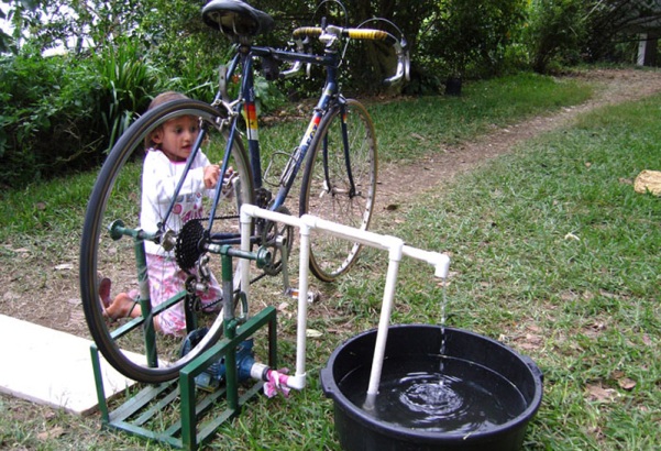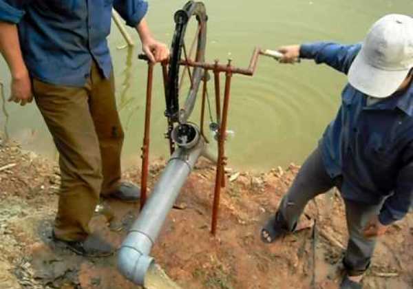 Je comprends que vous êtes intéressé par la solution d'une pompe à main, où la force centrifuge est utilisée. Au détriment de l'unité, sous le vélo sur lequel vous avez demandé - c'est la pompe centrifuge de surface elle-même. Ici, la tige n'est pas entraînée par un moteur électrique, comme cela avait été conçu à l'origine, mais par les pédales d'un vélo.