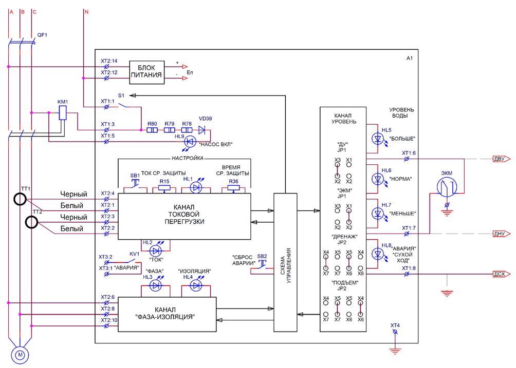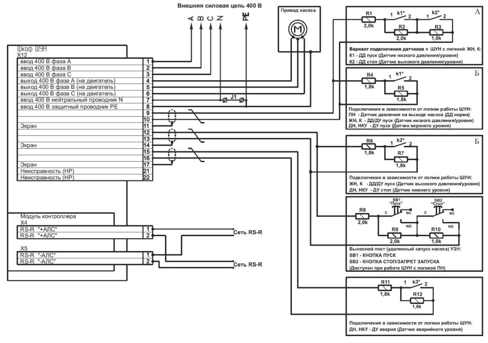Prenez SUN-0.18-15 (société Rubezh) comme échantillon, conçu pour le contrôle manuel et automatique des entraînements électriques d'une station de pompage. Le schéma de contrôle est le suivant: