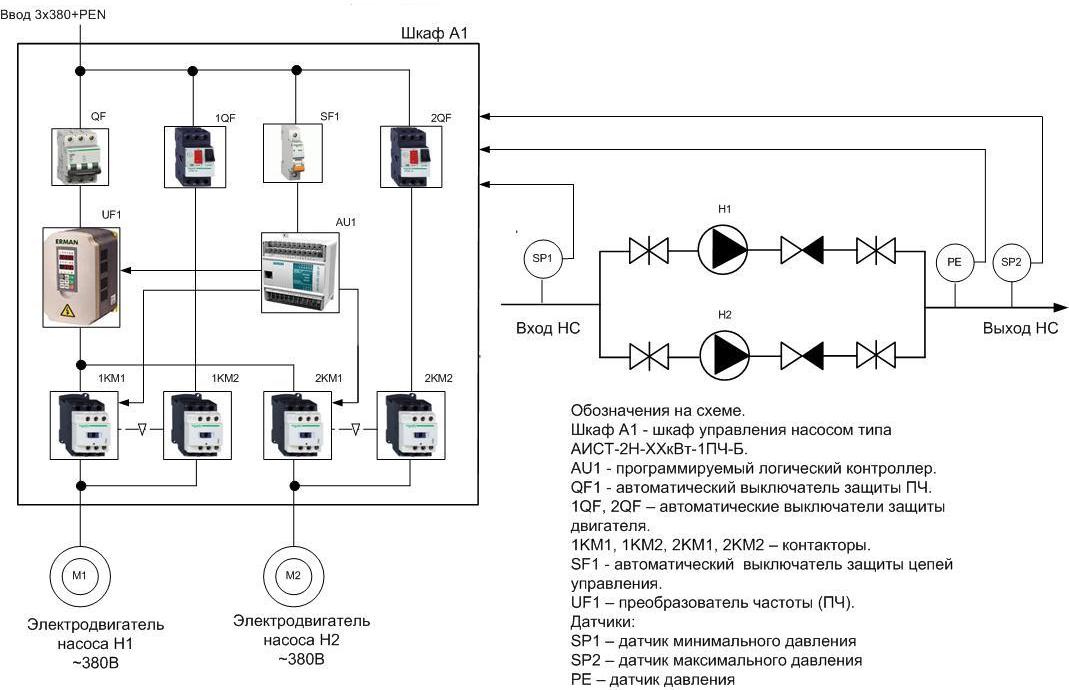 L'équipement est assemblé dans un environnement de production, au même endroit sont établis des schémas de circuit de l'armoire de commande de la pompe. Les plus simples sont les schémas de connexion pour une seule pompe, bien qu'un ensemble de dispositifs supplémentaires puisse compliquer l'installation.