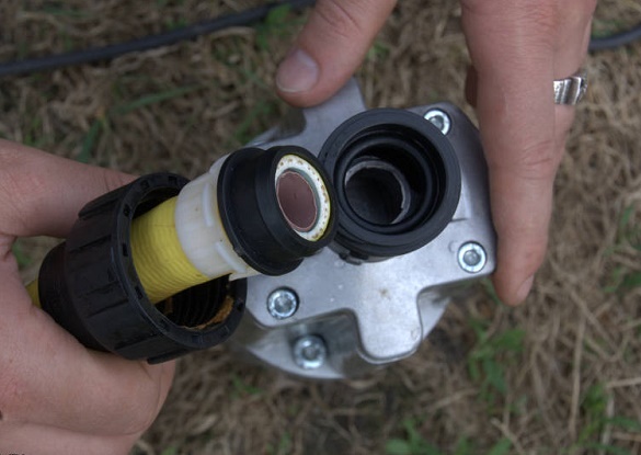 - Connectez le tuyau au tuyau d'évacuation de sortie à l'aide du coupleur fourni. Pour ce faire, vissez à moitié le raccord sur le filetage du tuyau, puis installez la section de tuyau dans le tuyau. Fixez la moitié de l'accouplement, le manchon et la bague en caoutchouc à l'extrémité du tuyau, puis poussez-le à fond. Au lieu d'un tuyau, des tuyaux en plastique de 3/4 ″ peuvent être utilisés.