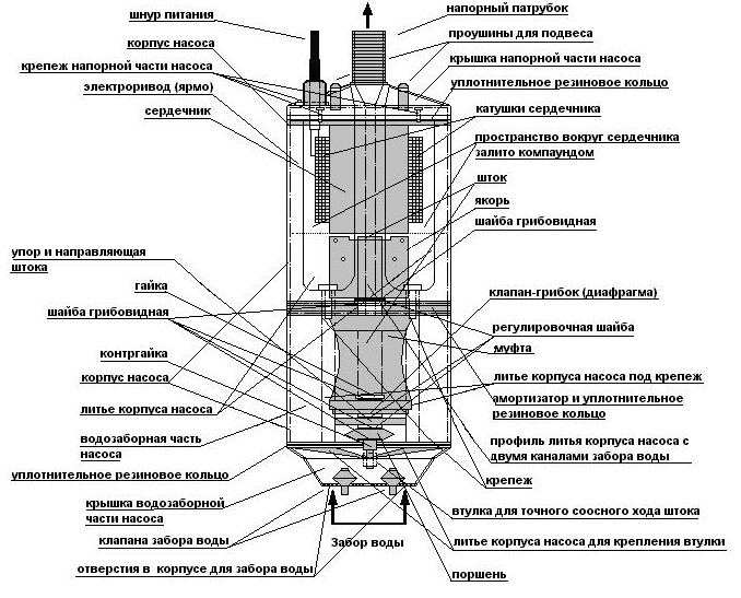 - Partie vibrante. Se compose d'un amortisseur, d'un diaphragme, d'un embrayage, d'une tige. Une ancre est située à une extrémité de la tige et un piston à l'autre. Il y a une certaine distance entre l'amortisseur et le diaphragme, les deux éléments guident la tige pendant le fonctionnement de la pompe électrique et assurent son étanchéité, empêchant l'eau de pénétrer dans la partie du boîtier où se trouve l'entraînement électrique.