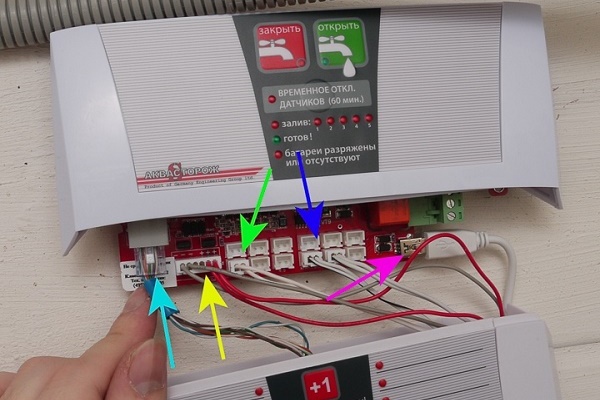 Maintenant, vous devez installer des capteurs câblés dans les endroits de fuites possibles: sous le bain, l'évier de la cuisine, près des toilettes, etc. Là où il n'y a aucun moyen de poser des fils, ils placent des dispositifs de signalisation sans fil. Ensuite, les capteurs de fils sont connectés en série avec des fils, en les insérant dans les prises correspondantes. Les fils sont connectés au contrôleur.