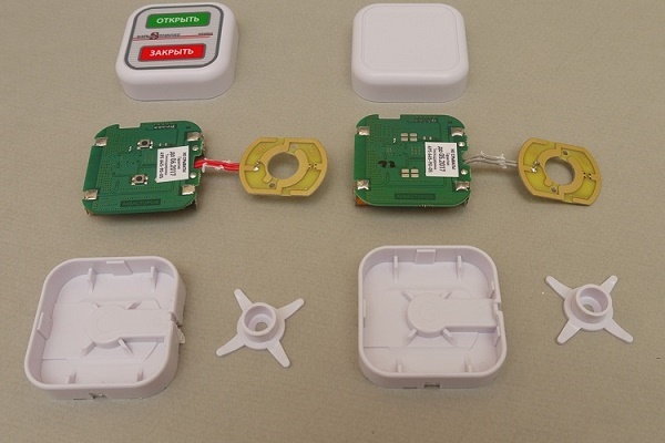 Le dispositif de capteurs de fuite «Aquastorozh» est simple et fiable. A l'intérieur se trouve une planche avec des contacts. Lorsque l'eau pénètre dans le capteur, les contacts se ferment et envoient un signal au contrôleur.