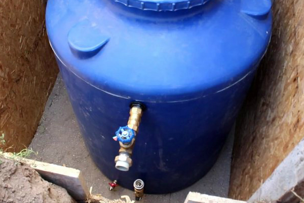 Si la construction tempête des tuyaux et des plateaux est en ordre, vous pouvez y attacher directement un grand réservoir préfabriqué en polyéthylène. Au bas du réservoir, installez un raccord - pour vidange d'urgence.