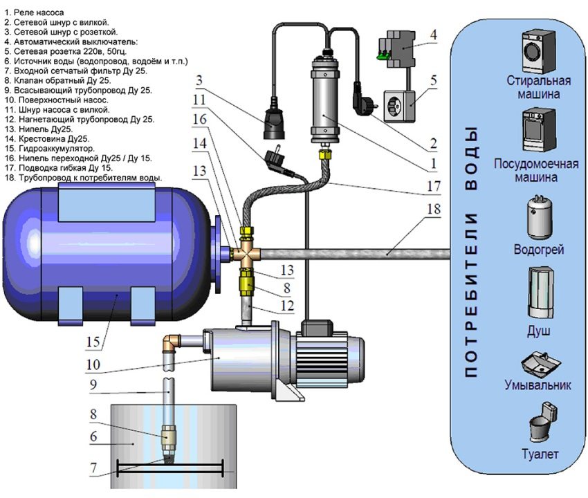 Dans le premier cas, les pompes pompent le liquide, créant sa circulation jusqu'à ce qu'une certaine pression se produise, cependant, avec le temps, il s'affaiblit. Dans le second cas, vous devez choisir une pompe d'une capacité égale au taux journalier de consommation d'eau.