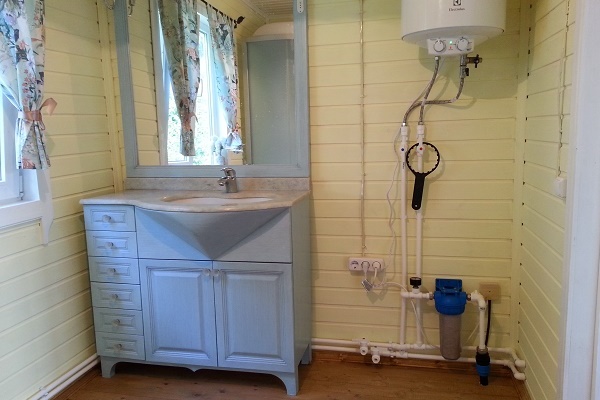 Nous avions la plomberie dans notre maison privée dans le village. Il n'y a pas d'approvisionnement en eau central ni d'égout à proximité, et je voulais vraiment les commodités. Nous sommes sortis de la situation nous-mêmes. Nous pompons l'eau de la rivière (à environ 100 m de la maison) à l'aide d'une unité de pompage. Dans le rôle des eaux usées, nous avons un tonneau enterré, il y a le drain des toilettes.Nous passons l'eau domestique à travers deux filtres à charbon et la pompons dans la rivière. Depuis un an, le système fonctionne sans défaillance, il n'y a pas d'odeur dans les toilettes, les tuyaux ne fuient pas. Il y a un mois, ils ont appelé les égouts pour pomper les drains du baril. Nous nous lavons dans le bain, à l'ancienne. Approvisionnement en eau uniquement dans la maison tenue.