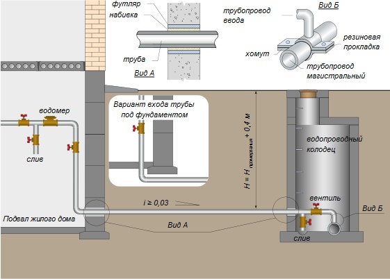 Si seule une résidence saisonnière dans la maison est supposée, l'alimentation en eau externe peut être ouverte de manière ouverte, c'est-à-dire directement sur le sol. Si le système est utilisé toute l'année, les tuyaux sont posés dans des tranchées, enterrés en dessous du niveau de gel du sol.