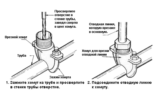 Lors du choix des tuyaux à tarauder, il convient de garder à l'esprit que le diamètre du tuyau de sortie ne doit pas dépasser la taille de celui dans lequel le trou est fait. Pour se connecter à une canalisation en plastique dont la pression est d'environ 1,6 MPa, des colliers de serrage sont utilisés.