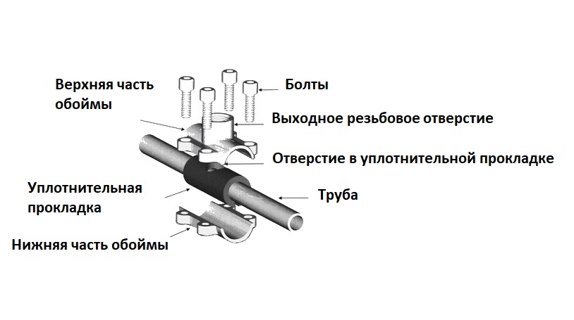 Pour insérer sans déconnecter l'alimentation en eau sur des tuyaux en acier amiante-ciment ou en fonte, utilisez une selle ou un collier de selle. Il se compose de deux parties et est équipé de boulons, grâce auxquels il comprime étroitement le tuyau de deux côtés. L'appareil est monté sur la canalisation à l'aide d'un support.