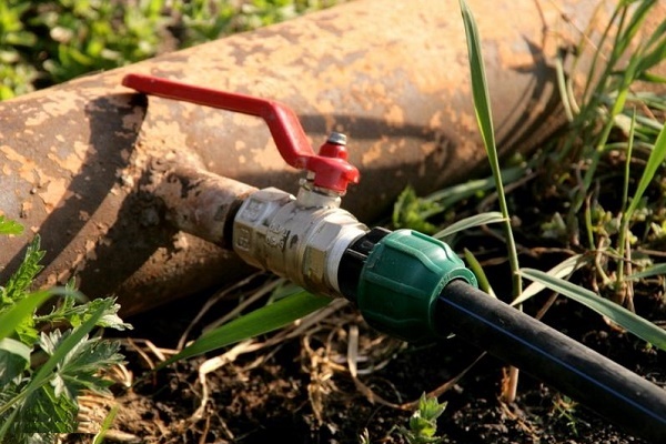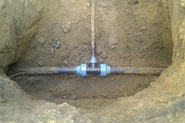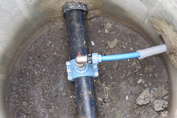 En appliquant l'une des méthodes ci-dessus, ils s'insèrent dans l'alimentation en eau existante sous pression. Au stade final, le tuyau de la branche externe du tuyau d'alimentation en eau est posé dans une tranchée et est connecté à la vanne d'arrêt au moyen d'un manchon à sertir.