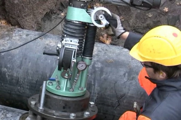 Une nouvelle section du tuyau d'entrée est connectée à une bride située sur la vanne. La pince est montée au-dessus du point d'insertion, puis, en chauffant les spirales de la machine de soudage, soudez avec le corps du tuyau. Le résultat est une connexion étanche à haute résistance.
