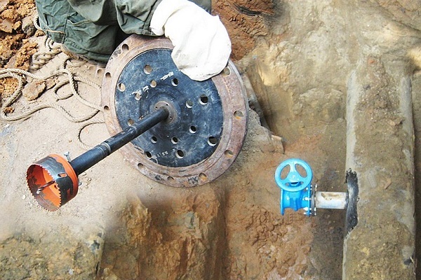 À l'autre extrémité du revêtement dans la zone où la perceuse sera enterrée, montez une valve avec un manchon. Un équipement de forage y est attaché, après quoi, à l'aide d'une perceuse conventionnelle, un trou est soigneusement fait dans le tronc.